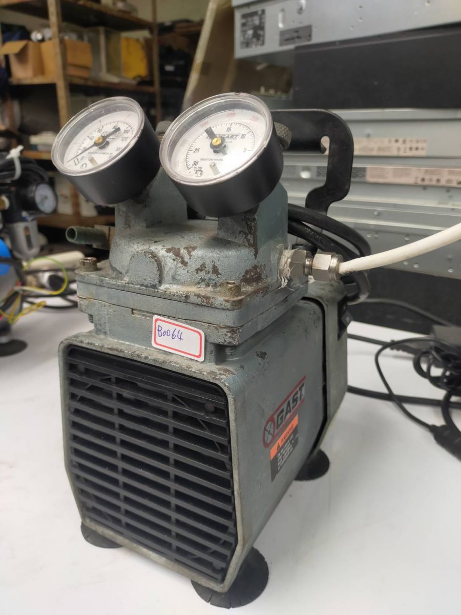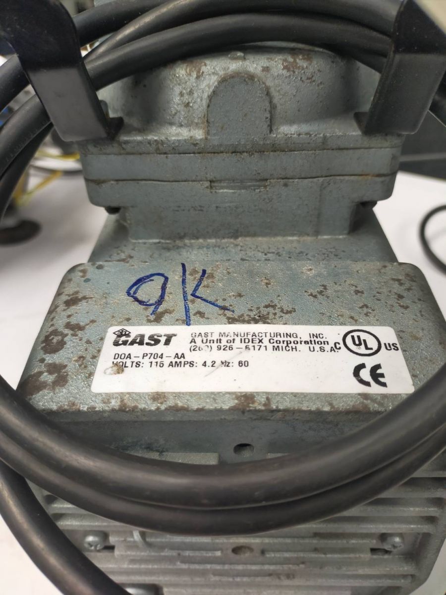 編號:B0064 品名:無油式真空幫浦 廠牌:GAST 型號:DOA-P704-AA 現況:115VAC,4.2A,60Hz,Maximum Vacuum: 25.5 in. Hg,Maximum Pressure 60 psi,Maximum Flow Rate 31 L/min,Weight 6.81 kg,Dimensions L19.3 x W16.5 x H27.1 cm。重量輕(6.8kg)可手提,可做抽氣及打氣。隔膜式,完全無油、不污染實驗。有過負荷保護設計。有真空、壓力調整閥,滿足不同需求。 地點:桃園市 保固期:可看物件實體或現場試機,不保固,現況點交,不退、換貨。 售價:現金價,新台幣 15,000元(未稅價,可議價,運費另計),歡迎來電。